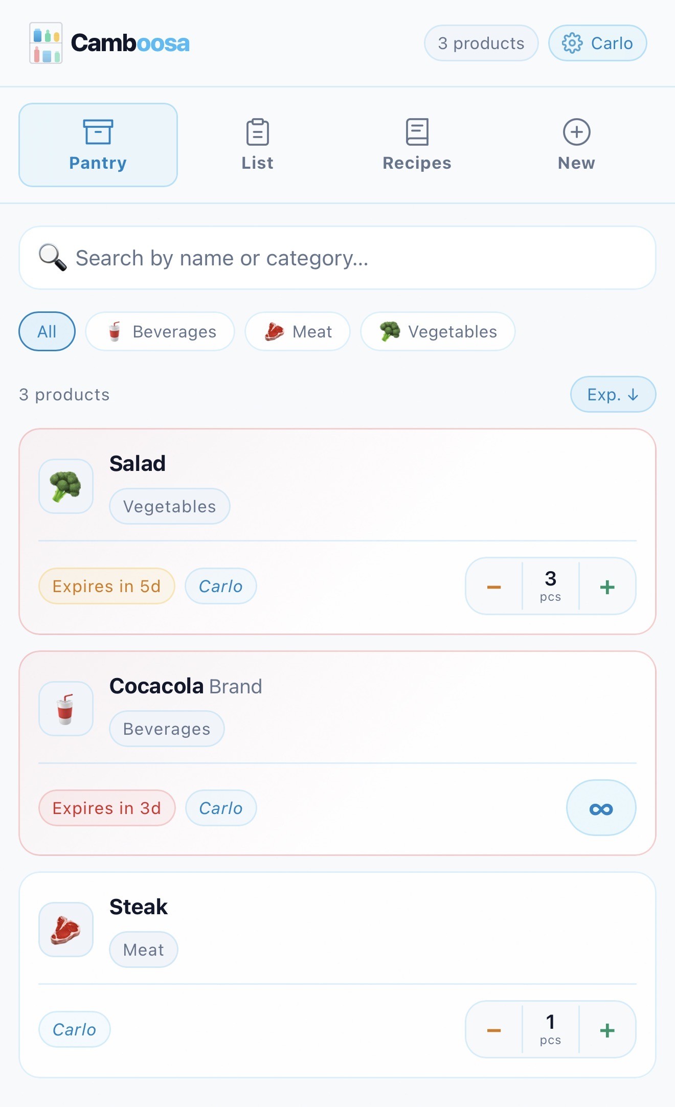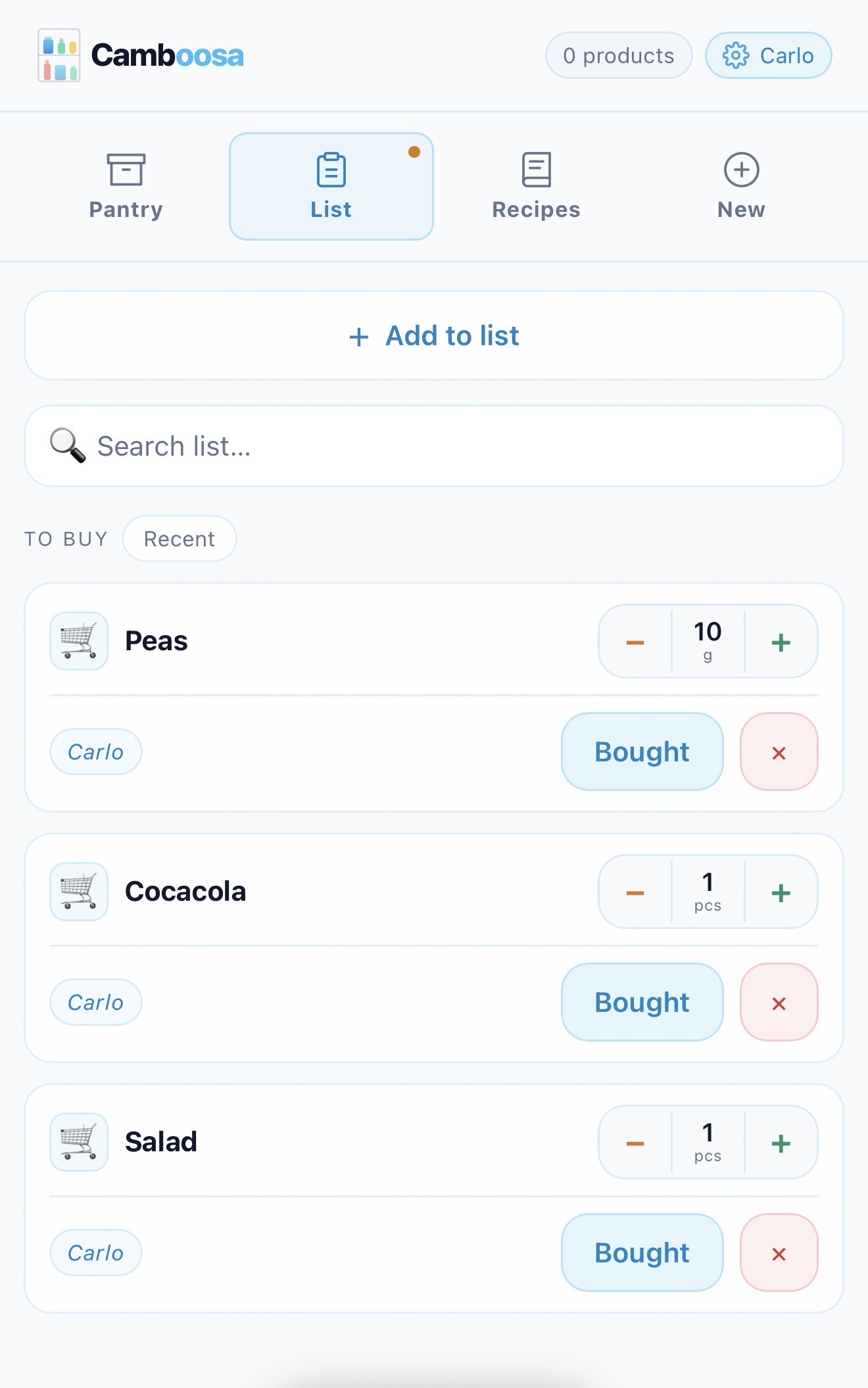 Camboosa coordina dispensa, lista della spesa e ricette in modo fluido. Aggiungi prodotti con lo scanner barcode, tieni d’occhio le scadenze e cucina ciò che ami con porzioni scalabili.